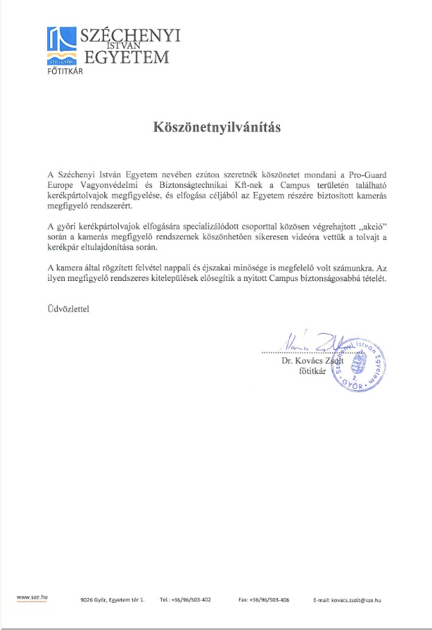 | A ProGuard Europe Kft és a Széchenyi István Egyetem között létrejött együttműködés keretében a közbiztonság megerősítésére kamera rendszer kiépítésére került sor. A közös akció révén a kerékpárlopások száma lecsökkent, valamint az elkövetők a jó minőségű kameraképeknek köszönhetően kézre kerültek. Dr. Kovács Zsolt főtitkár úr levélben köszönte meg a technikai segítséget és az eszközök biztosítását. |